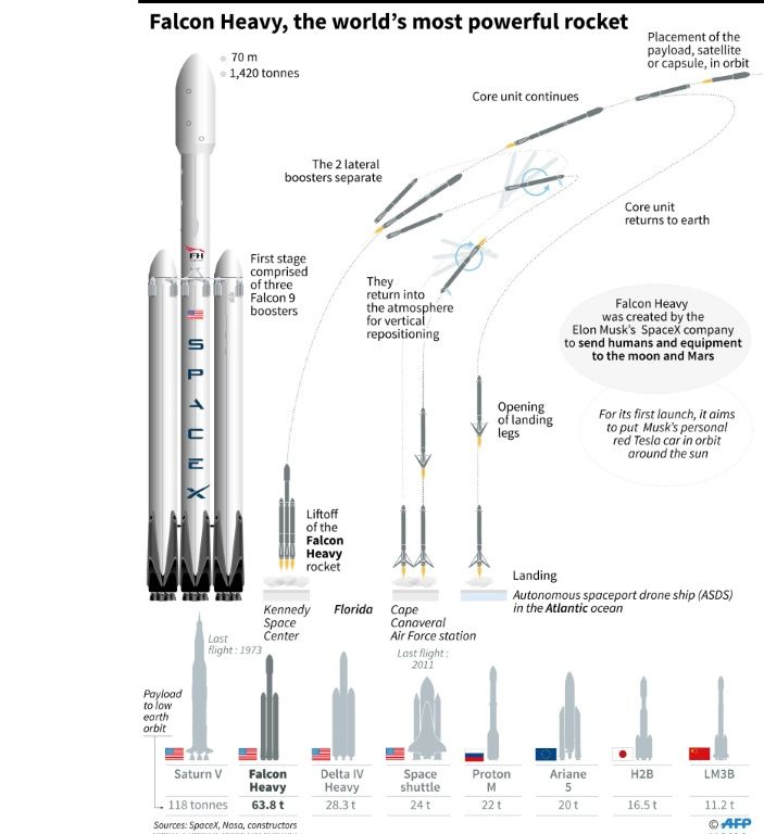 Description and facts on the Falcon Heavy rocket, with comparison of other major launch vehicles. Photo: AFP