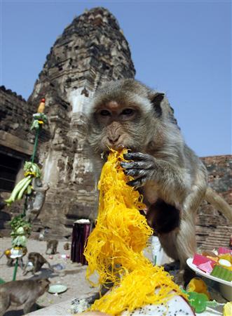 LOPBURI, Thailand (AFP) - It is a feast fit for a monkey king. On Sunday the central Thai town of Lopburi put on a five-star banquet for its hundreds of macaque inhabitants, sparking a mass simian food fight.