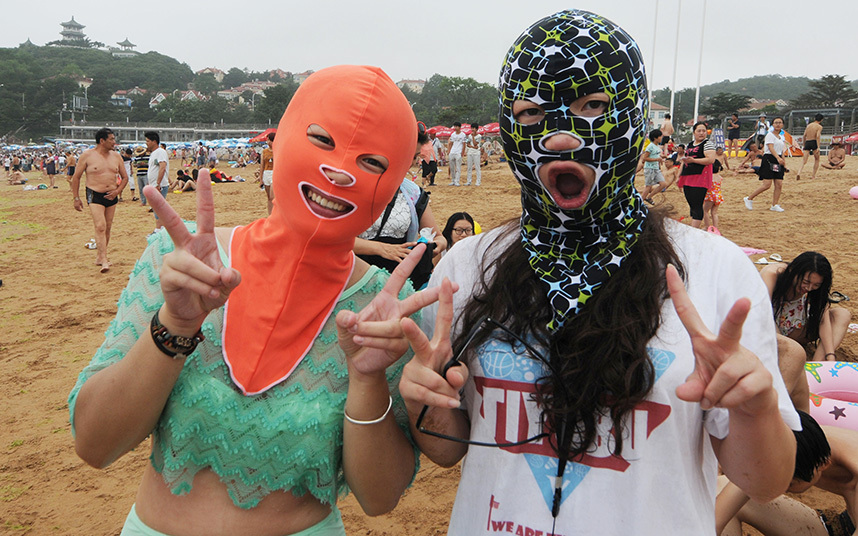 People wearing facekinis on a beach in Qingdao, Shandong Province, eastern China