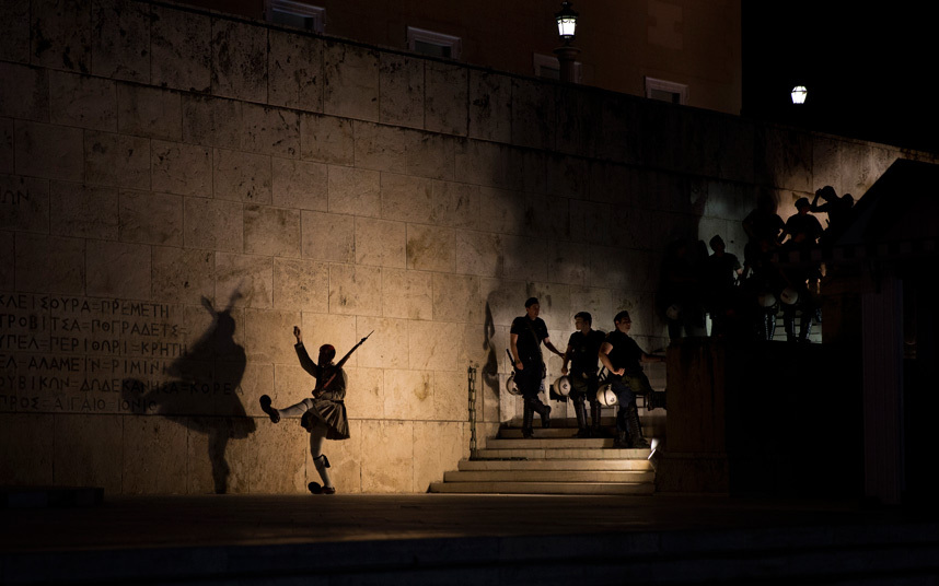 A presidential guard marches near the tomb of the unknown soldier as riot police secure one of the entrances of the parliament during an anti austerity protest in Athens