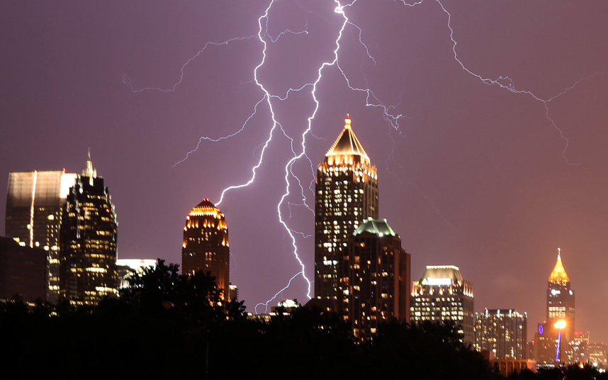 Lightning lights up the midtown Atlanta skyline as strong storms move through the area