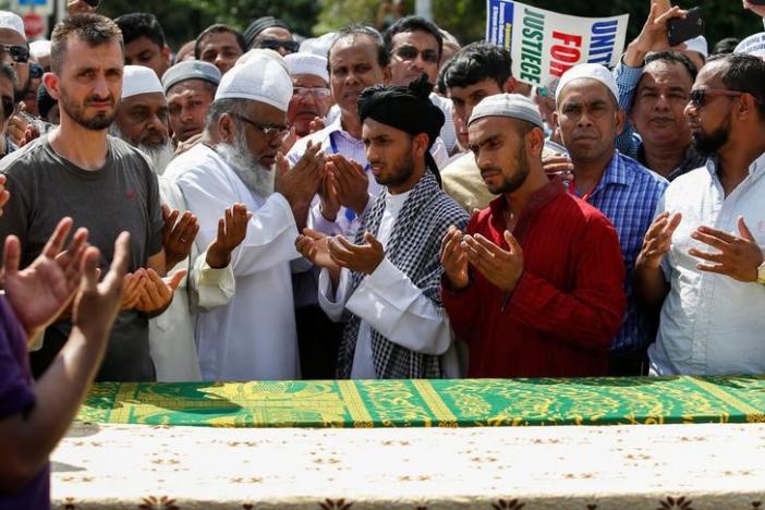 Community members pray next to the coffins of Imam Maulama Akonjee, and Thara Uddin during the funeral service in Queens. REUTERS/Eduardo Munoz