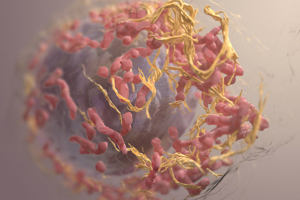 This is a rendered 3D image of a melanoma cell using data obtained using ion abrasion scanning electron microscopy. (Donald Bliss and Sriram Subramaniam; National Library of Medicine, NIH)