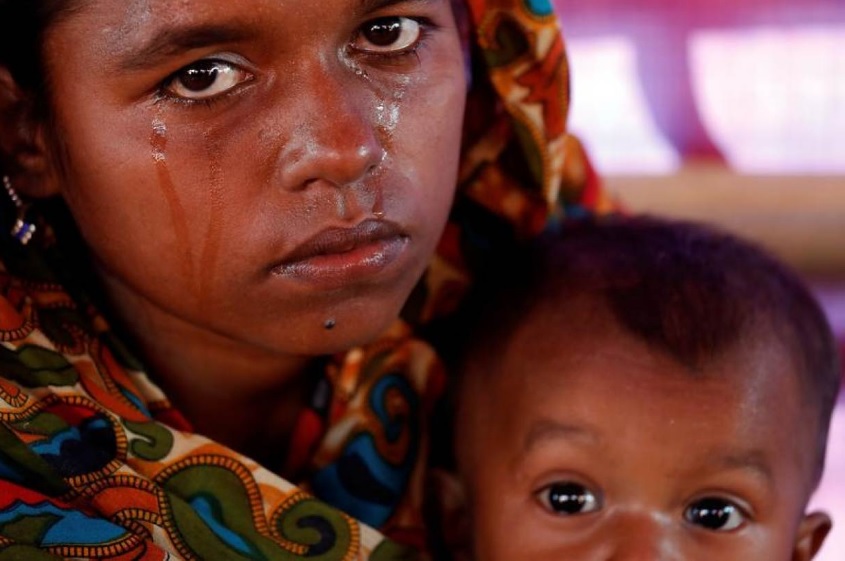 Aisha Begum, a-19 year-old Rohingya refugee, holds her daughter and cries as she tells her story at the camp for widows and orphans inside the Balukhali camp near Cox’s Bazar, Bangladesh. Photo: Reuters