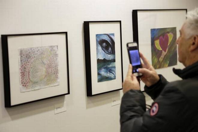 A man takes a picture of artwork made by detainees of the Guantanamo Bay Detention Camp at an exhibit at at the John Jay College of Criminal Justice in New York. Photo: AFP