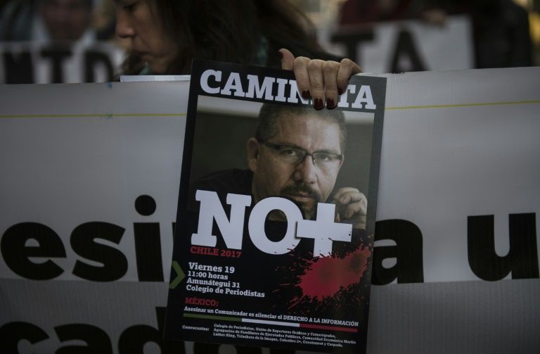 Chilean journalists hold signs condemning violence against journalists while protesting the recent murder of Mexican journalist Javier Valdez. Photo: AFP