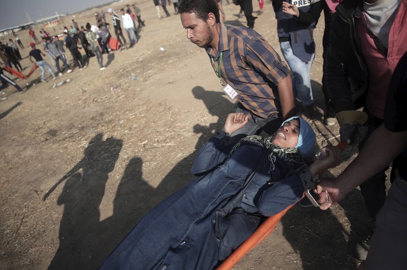Palestinian protesters carry a wounded woman during a protest at the Gaza Strip’s border with Israel. Photo: AP