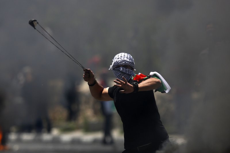 A Palestinian protester hurls a stone during clashes with Israeli forces after a rally to mark the 70th anniversary of what Palestinians call their “nakba,” or catastrophe. Photo: AP