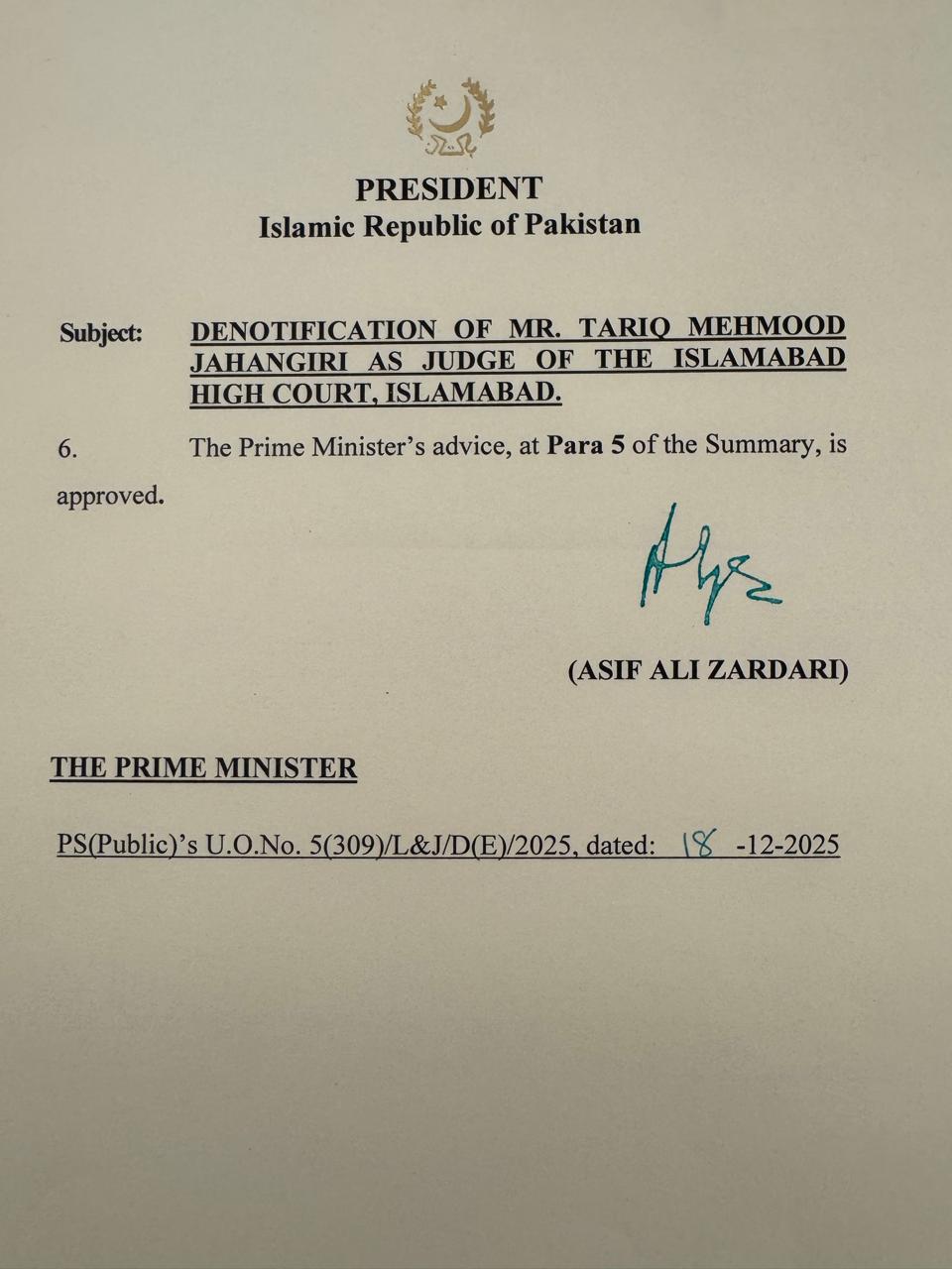 The de-notification has been issued in compliance with the decision of the Islamabad High Court, which declared his appointment as a judge to be illegal and ordered him to vacate office.