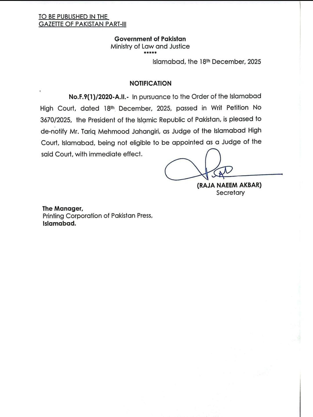 After the approval by the President, the Ministry of Law and Justice has issued notification to officially de-notified Tariq Mehmood Jahangiri as judge of the Islamabad High Court.